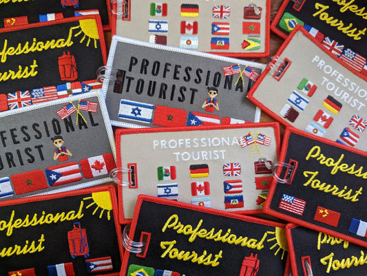 PROFESSIONAL TOURIST Luggage Tag. Worldwide! Taupe background